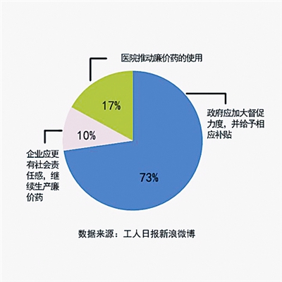 而本报新媒体做的一项调查显示,为让百姓买到廉价药,排在首位的建议是“政府应加大督促力度,给予药企相应的补贴”,其次是“医院应推动廉价药的使用”,再次是“企业应更有社会责任感,继续生产廉价药”。